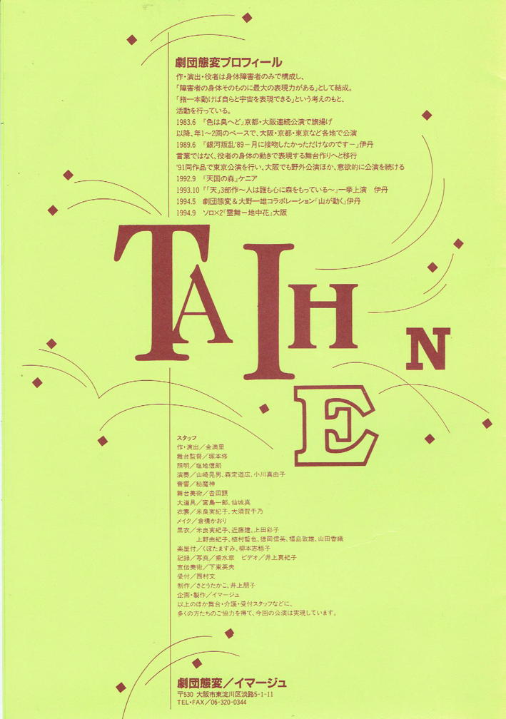 態変は第1次期の83年『色は臭へど』という作品で幕を開け、障害者の鋭い毒づきで始まりました。そして、第2次期を89年に『銀河叛乱'89』で純粋にアートを追究する方向を打ち出し、今『ダ・キ・シ・メ・タイ!!』で第3次期に入ろうとしているように思います。