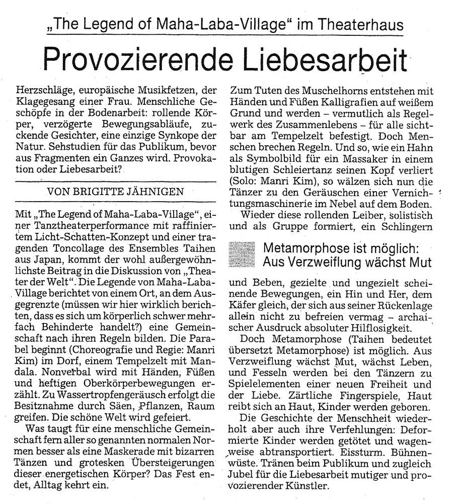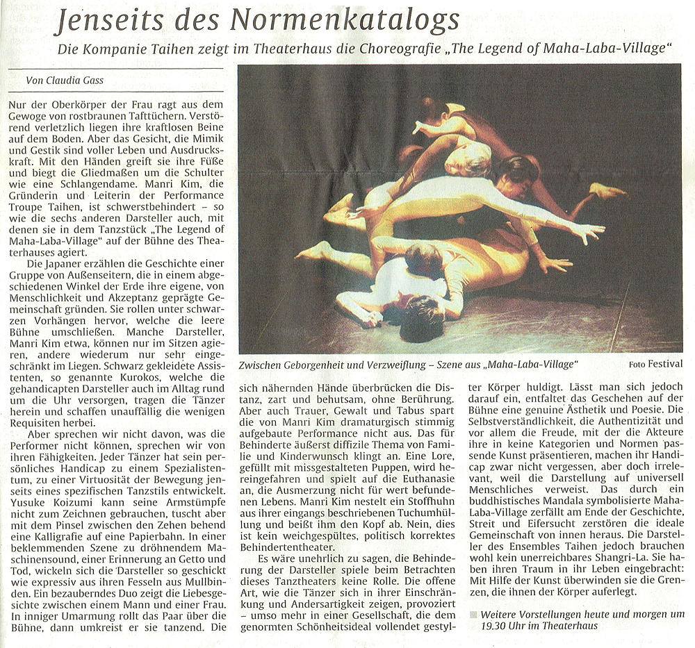 日本から来た劇団態変の『マハラバ伝説』は、洗練された光と影のコンセプトと印象的な音のコラージュを伴うダンスシアターパフォーマンスであり、「Theater der Welt(世界劇場)」をめぐる議論に、おそらく最も異例の貢献をするだろう。マハラバ村の伝説は、ある土地のことを語る。そこでは排除された者たち(ここで、これが重度の身体障碍者たちによる劇なのだと述べておく必要はあるだろうか?)が、自分たちのやり方で共同体を創る。この寓話(振付・演出:マンリ・キム)は、村の曼荼羅のあるテント寺院から始まる。言葉を使わずに、手、足、そして激しい上半身の動きを使って、物語が語られる。水滴の音に合わせて、種まき、植栽、場所取りにより、占有ということが起こる。美しい世界が讚えられる。