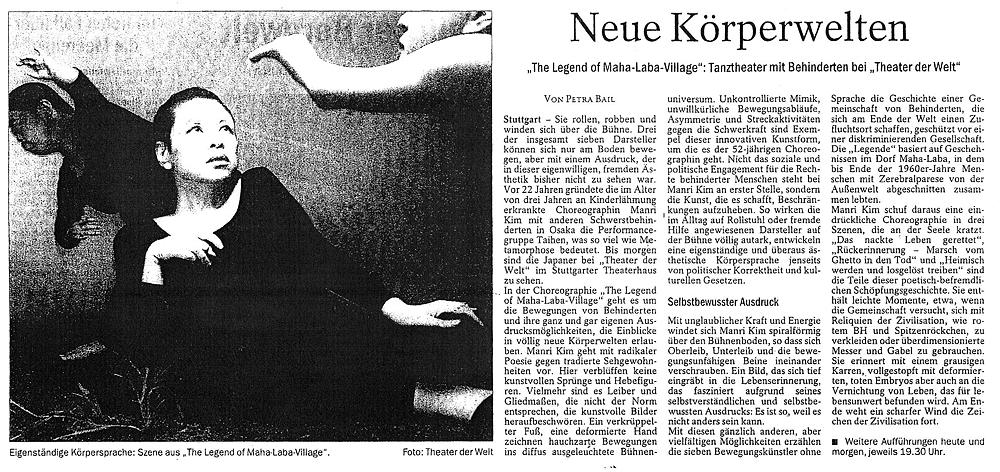 シュトゥットゥガルト − 役者たちは舞台の上を転がり、這い回り、体を曲がりくねらせて踊る。7人いる役者のうち3人は立って歩くことができないが、床の上で繰り広げられるその身体の動きは今までに見たことの無いような独自性と異質さを兼ね備えた美しさである。3歳の時に小児麻痺にかかった振付師であり監督である金満里氏は今から22年前に他の身体障害者らとともに大阪で劇団『態変』を立ち上げた。劇団の名前は変身や変形を意味する言葉メタモルフォーゼに由来している。 この『態変』による公演は明日まで見ることが可能である。